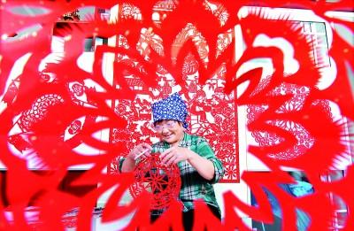 在山东省淄博市沂源县悦庄镇中营村,民间艺人在创作“七夕”剪纸作品。赵东山摄/光明图片