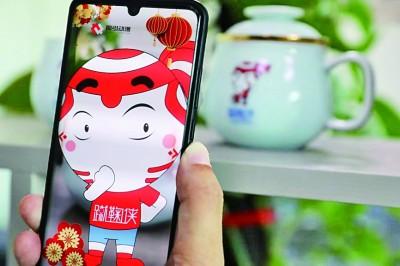 图为蹴鞠侠文创衍生品陶瓷杯,观众用手机扫描后,可在屏幕上与蹴鞠侠动画互动。卢鹏摄/光明图片