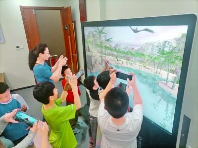 在山东省淄博市博山区图书馆,小朋友们参加AR互动百科·恐龙亲子体验活动。燕飞摄/光明图片