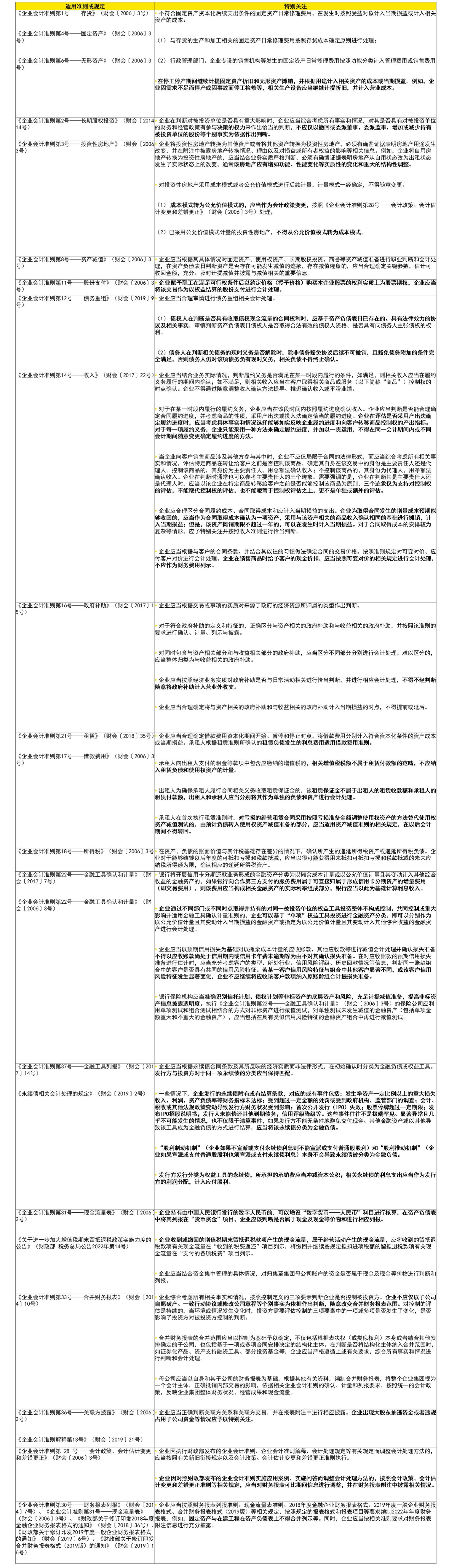 2022年,财政部为推动企业会计准则体系的有效运行和加强准则监管,开展了2021年度企业会计准则实施情况的分析工作。财政部在分析工作中发现,在准则规定明确且有相关指引的情况下,仍有部分企业无视准则规定,明知故犯,滥用会计估计和职业判断。财政部已将此类“明知故犯”的部分问题作为准则实施重点技术问题纳入通知。通知提示的应予关注的准则实施重点技术问题列示如下: