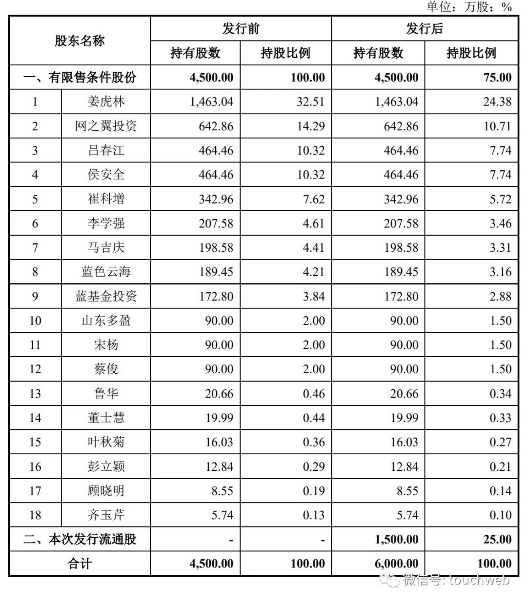IPO后,姜虎林持股为24.38%,网之翼投资持股为10.71%,吕春江、侯安全分别持股为7.74%,崔科增持股为5.72%,李学强持股为3.46%,马吉庆持股为3.31%,蓝色云海持股为3.16%,蓝基金投资持股为2.88%;