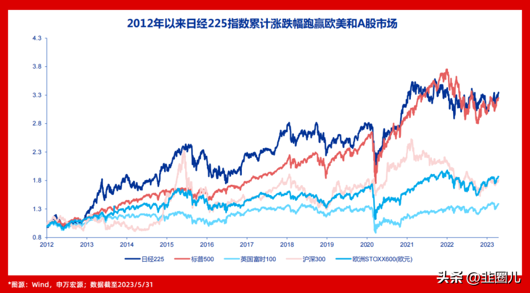 其实,我们都错了,日经225不是今年才涨起来的,从2012年以来的涨幅就已经与标普500近似,早已大幅跑赢了英国富时100、欧洲STOXX600(欧元),以及我们的沪深300了。