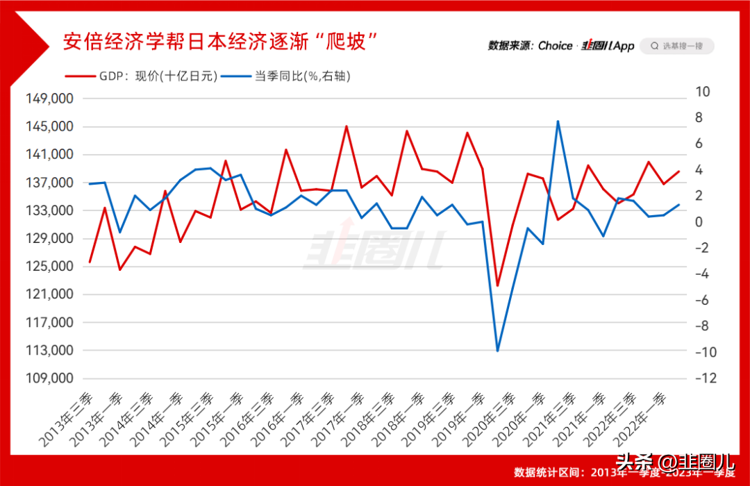 事实证明,效果比较显著,日本GDP确实在2012年后迎来了一个逐渐爬升的过程,虽然在2020年,疫情的突然爆发打断了这个势头,但在日本防疫放开之后,也慢慢得到了修复。