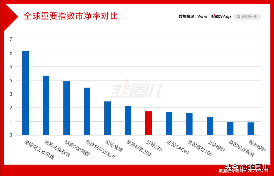 近期虽然涨了不少,但截止2023年5月31日,日经225指数依然在全球重要指数的市净率中排名中等,投资价值相对较高。