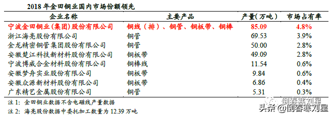 公司拥有超过30 年的铜加工和再生铜生产利用经验,是国内规模最大的铜加工企业之一。2014-2017 年公司铜加工材产量居国内首位,2018-2019 年以93 万吨和103 万吨的铜加工材产量持续保持行业龙头地位。公司专注于铜加工,产品涵盖再生铜冶炼产品(阴极铜)、铜加工产品(铜棒、铜板带、铜管、铜线(排)等)、铜深加工产品(电磁线、阀门、水表等),是国内少数几家能够满足客户对棒、管、板带和线材等多个类别的铜加工产