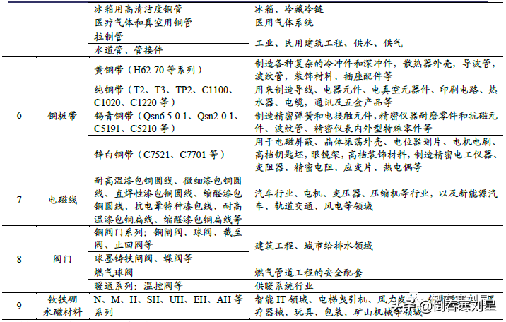 铜是重要的工业金属,其消费与经济增长息息相关,应用领域主要集中在电力、家电、交通运输、建筑以及电子等。电力一直是铜材产品消费的最大领域,占比将近50%,空调制冷、交通运输、电子、建筑也是重点需求行业,上述五大行业的铜材产品消费量合计占比90%左右。