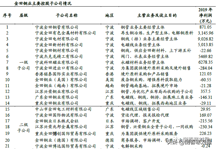 立足长三角,积极拓展珠三角、西南地区及海外业务。截至招股意向书签署日,公司共拥有金田铜管、金田有色、金田电材、金田新材料等21 家控股子公司,2 家参股公司。金田铜管、金田有色、金田电材、金田新材料、杰克龙精工和科田磁业分别为公司铜管、阴极铜、铜线(排)、电磁线、阀门和永磁材料业务的主要经营主体。广东金田、重庆金田为2018 年下半年新设,主要经营电磁线、铜线、铜排等铜制品,是公司拓展珠三角和西南地区业务的重要经营主体。此外,公司也在境外设立了平台公司,未来海外业务有望实现进一步发展。