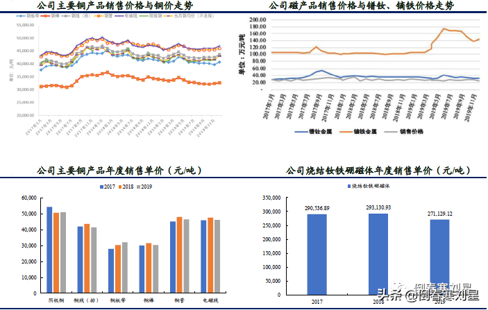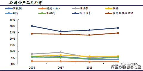 铜加工是公司产品收入和利润的最主要来源,铜深加工和永磁材料业务盈利能力强。2016-2019 年,铜加工业务占公司主营业务收入的比重均在80%以上,毛利贡献也在70%左右,是公司产品收入和利润的最主要来源,2019 年,公司铜加工业务贡献了产品收入的85%,贡献产品毛利的69%。此外,永磁材料和铜深加工产品特别是阀门水表,由于加工程度、定制化程度高,盈利能力强,毛利率高,2016年以来烧结钕铁硼磁体和阀门水表的毛利率均在20%以上的水平。2019 年,铜深加工以12%的产品收入贡献了21%的产品毛利,永磁材料以1%的产品收入贡献了8%的产品毛利。