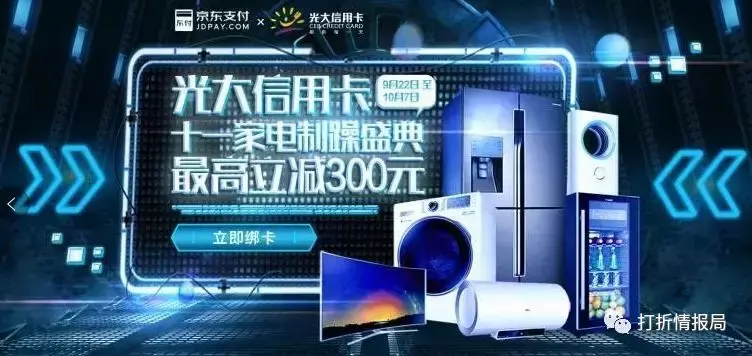 光大银行信用卡持卡人在京东商城购买家电品类实物商品,通过京东支付-光大信用卡支付可享受支付金额