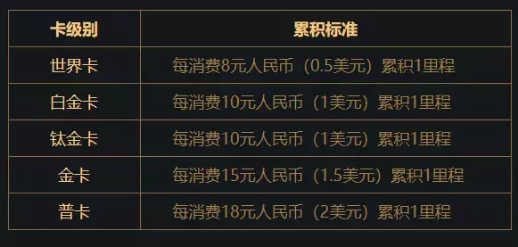 白金10:1、金卡15:1,另外有合作商户消费额外里程奖励