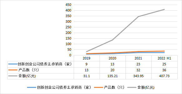 2017年7月,中国证监会发布《中国证监会关于开展创新创业公司债券试点的指导意见》,标志着一个新兴的以重点支持创新创业型企业为主要目标的公司债券品种正式推出,下一步证监会将继续推广试点工作。将证券公司承销“双创债”的情况,作为证券公司分类评价中社会责任评价的重要内容。中国证券业协会建立“双创债”专项信息统计和评估机制,对证券经营机构开展“双创债”中介服务的工作成效进行考评。支持和鼓励证券公司履行社会责任和行业责任,积极开展“双创债”中介服务,同时加强“双创债”理论研究和业务创新。中国创新创业债券承销情况整体情况向好,2022上半年创新创业债券承销主承销商达到25家,共承销36只产品,承销金额达到407.73亿元,已超过去年一年水平。