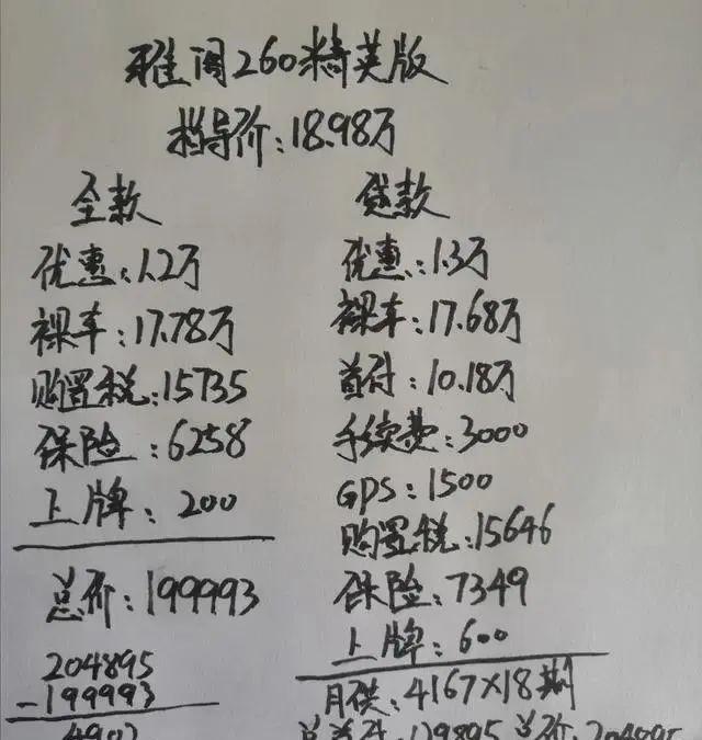 全款买的话购车费用比较简单清楚,除了车款之外,再交上1.57万的购置税,6000多的保险以及200块钱的上牌费就够了,以目前的优惠行情来计算,全款总落地价是199993元,基本上就是20万。
