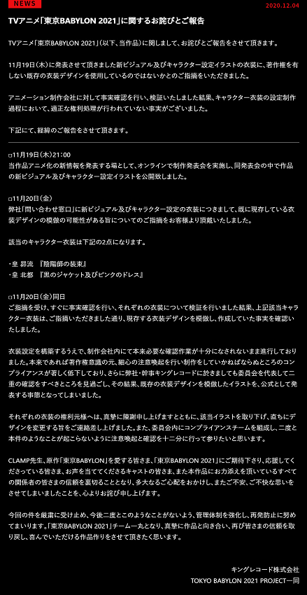 而说到“某些原因”的话,想必不少网友都比较清楚。就在去年年尾的时候,有网友爆出《东京巴比伦》的部分角色服装严重抄袭某韩国时装杂事上的服饰,因此引来不少网友争相讨论并且炎上,官方在得知此事之后迅速出文道歉并且下架角色设计图并且进行修改。