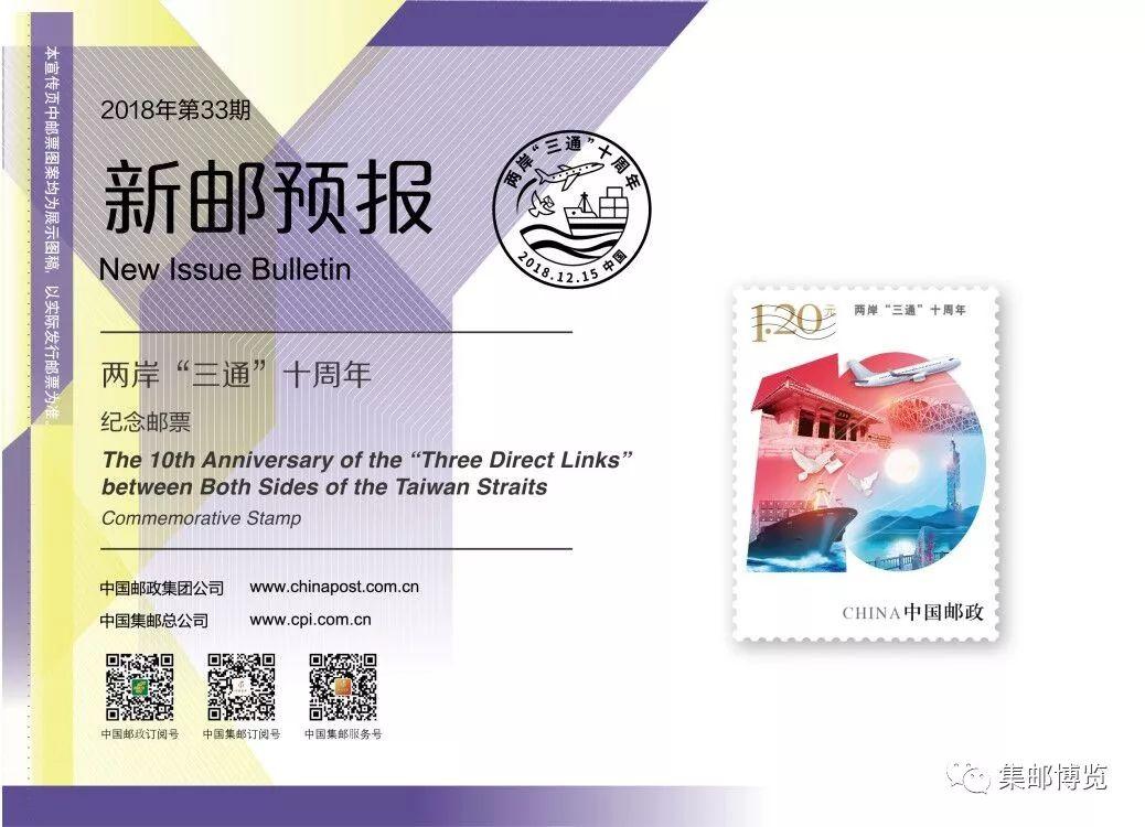 中国邮政定于2018年12月15日发行《两岸“三通”十周年》纪念邮票1套1枚,面值1.20元。