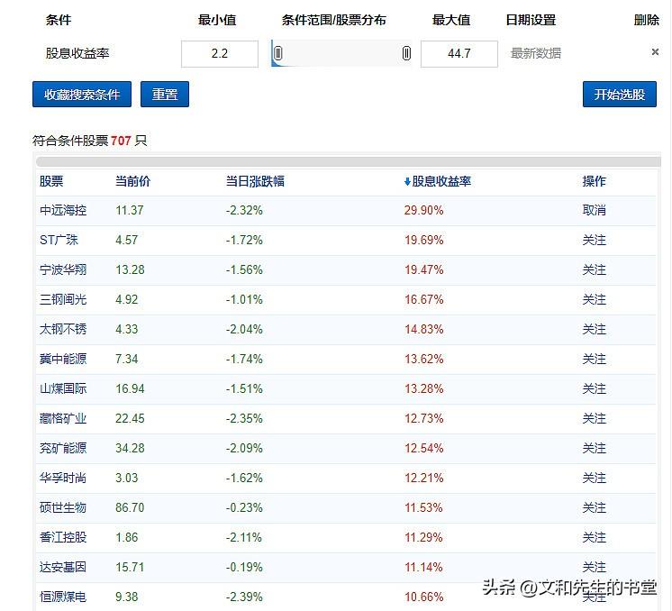 2、利用网络上的股票筛选器,选择股息率大于2.19%的股票。如下图所示,A股市场2023年4月14日,股息率大于2.2%的股票数量707只。