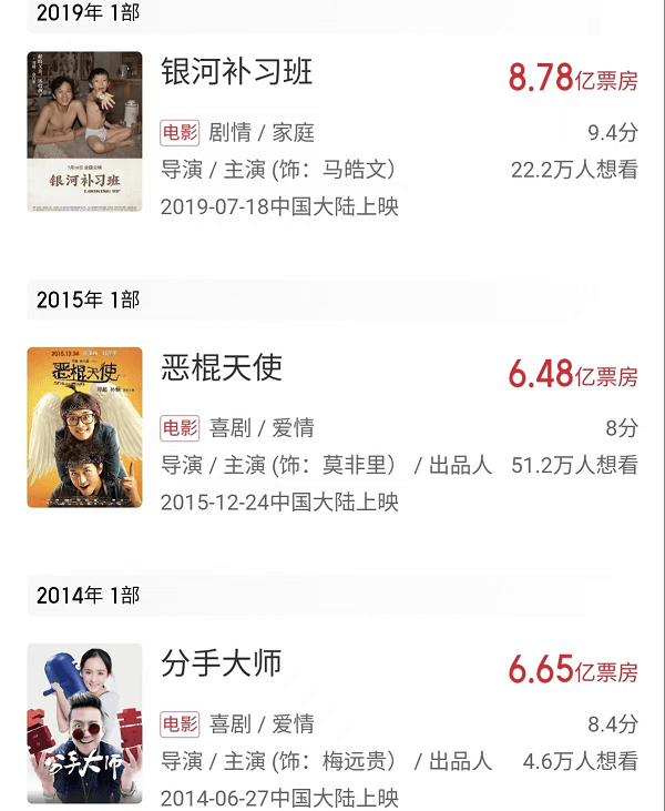 之后,两人放下喜剧,拍了一部探讨亲子教育的剧情片《银河补习班》,2019年暑期上映,卖了8.78亿元。《银河补习班》比前两部喜剧口碑上有进步,但离优秀还很远。