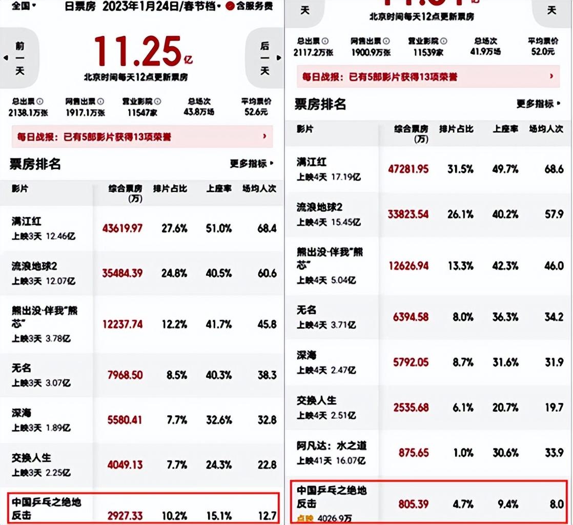 大年初三上映后,面对其他六部各具特色,市场表现都很强的同档电影,《中国乒乓》毫无竞争力,上座率、票房远远垫底,初四排片占比大幅下滑。