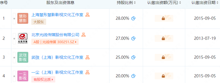 天津橙子映像传媒由邓超的上海慧形慧影影视文化工作室控股,慧形慧影持股28%。俞白眉的武弢(上海)影视文化工作室持股25%,为第三大股东。 第二大股东北京光线传媒持股27%。光线是《分手大师》《恶棍天使》的出品方,曾推动两人走上导演之路。
