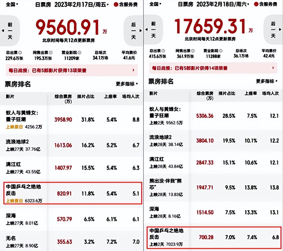 可2月17日正式上映后,《中国乒乓》还是遭遇了惨败,首日票房820万元,场均人次5.1,还不如老片《流浪地球2》《满江红》《深海》《无名》《熊出没·伴我“熊芯”》,只比《交换人生》强一些。