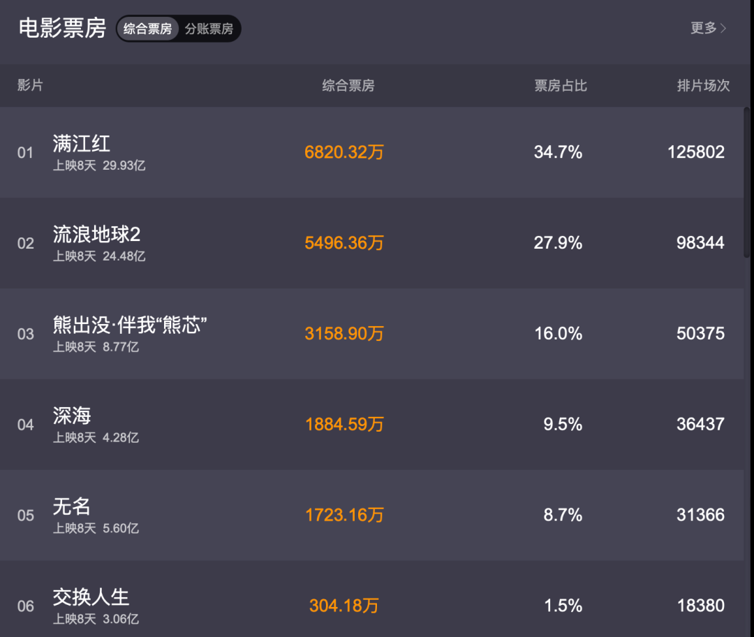 同样的故事也在近两年发生。2022年《长津湖之水门桥》《这个杀手不太冷静》一共揽下38亿票房,占比超总票房的60%,而今年的《满江红》《流浪地球2》两部电影,也贡献了整个春节档70%的票房。