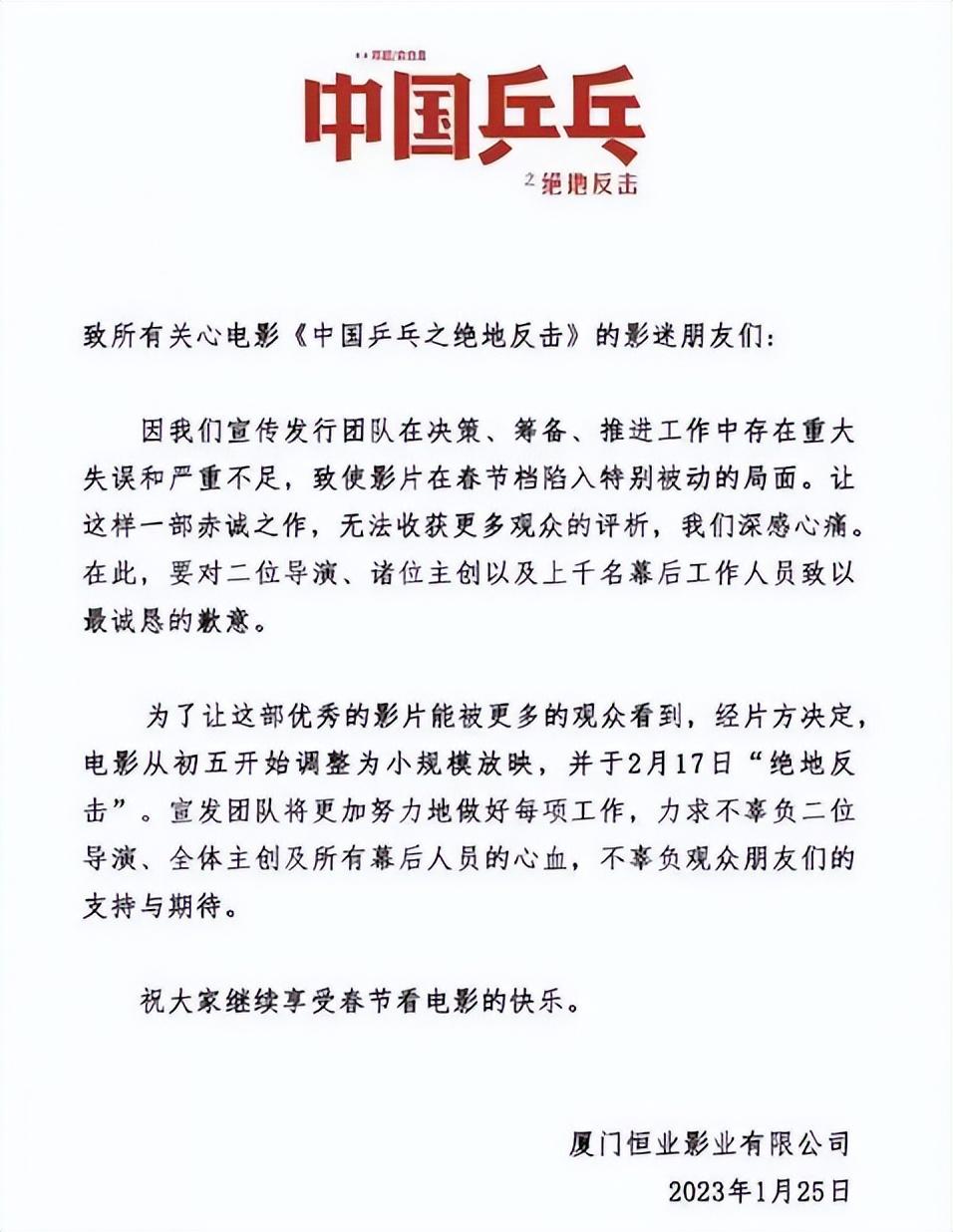 李一凡从事电影宣发5年,这还是他第一次见到有电影从春节档上撤下。尽管早在官宣延档之前,他就听说了调整影片密钥有效期的消息,但他没想到的是,仅仅是几小时之后,1月25日晚间,他所在的中国乒乓出品方恒业影业就发布声明,称撤出春节档期,改为2月17日大规模放映。在这份声明中,更是少见地、言辞激烈地批评了宣发团队——“在决策、筹备、推进工作中存在重大失误和严重不足”,才让影片在春节档陷入被动的局面。