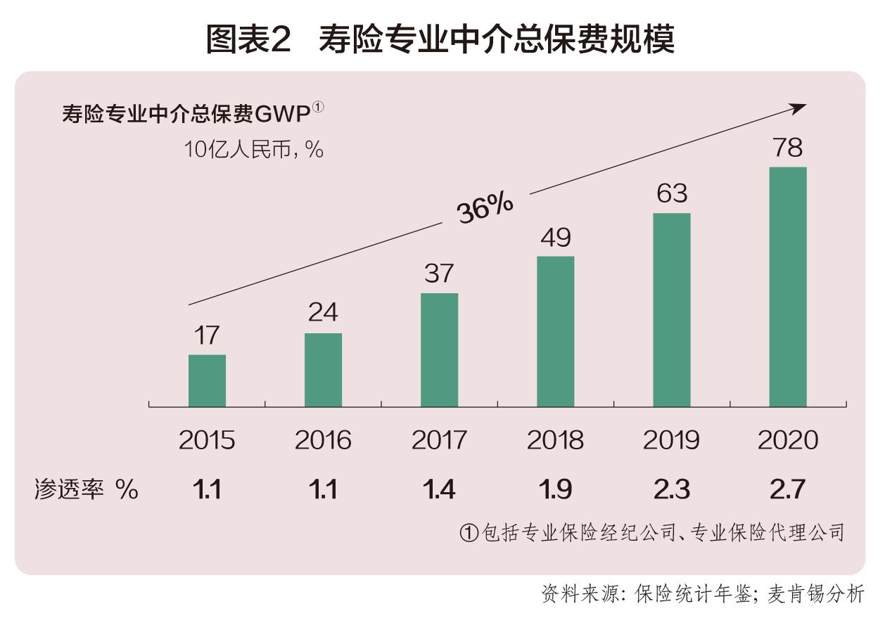 2020年中国寿险市场总保费规模达到2.95万亿,其中专业中介机构的渠道占比仅为2.7%,远低于代理人及银保渠道。然而该类机构基数虽小但增速可观,五年的复合增长率达到36%,高于寿险市场整体的15%(图表2)。
