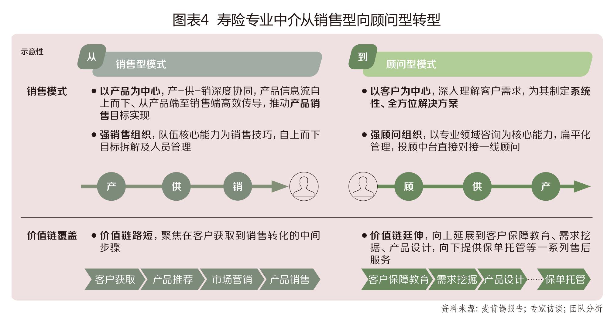 过去寿险中介机构在业务模式及关系定位上都更接近传统代理销售,以产品销售而非用户需求为导向,并未发挥经纪业务客观、中立的专业服务本质。未来,寿险专业中介机构必然持续升级,从销售型模式向顾问型模式转型,充分发挥中介机构自身优势,接受顾客委托、站在客户利益上配置产品及提供咨询服务(图表4)。