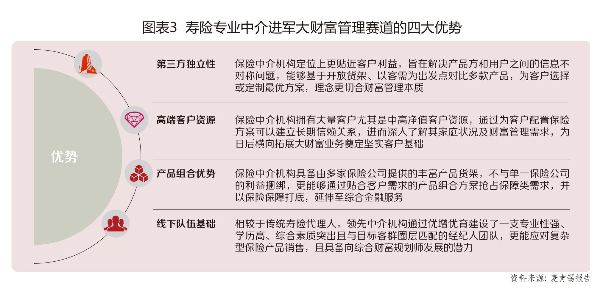 其次,相较保险行业其他类型机构,寿险中介机构天然更贴近第三方财富管理公司,领先的寿险中介机构具有定位高端客群、向财富管理转型的潜力。麦肯锡的报告认为,相比其他类型机构,寿险中介机构在大财富管理赛道具有四大得天独厚的优势:第三方独立性、高端客户资源、产品组合优势以及线下队伍基础(图表3)。