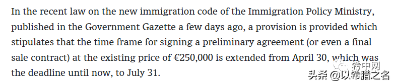 据每日报报道,近日希腊政府公布了新移民法的最新政策,规定了欧盟以外的投资者可以以25万欧获得居留的政策截止时间从4月30日延至7月31日。