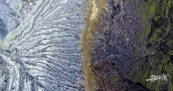 在本周日,朱丹将踏上寻访蓝莲圣火的旅程,在颇具上帝视角的航拍镜头记录下,朱丹孤独的身影行走在浓烟密布的伊真火山山脊上,宛如沙尘般渺小。在她的两侧,伊真火山被分成了两种景象,一半是如天堂般的浓绿,一半则是毫无生机如炼狱一样看不到任何流动的景象和生命的灰白。在朱丹看来,这样的景象令人窒息。