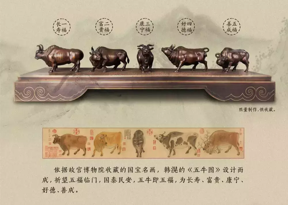 朱炳仁·铜根据《五牛图》进行立体化呈现,以全铜材质塑造了逼真的、活灵活现的五牛案头摆件“五牛积福”,意为“五福临门”,作为国礼赠送给外宾。