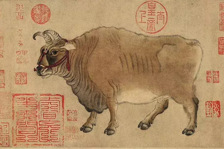 根据画卷上的诗文题跋等可知,在整个宋代,它一直被珍藏在皇宫内苑。金兵进犯,宋高宗赵构在兵荒马乱中仓皇南渡也没有忘记带走这幅名画。元、明时期,此图先后辗转赵伯昂、赵孟頫、项元汴等收藏家之手。入清,直到清乾隆皇帝广诏天下珍宝,这幅画重回内苑。1900年,八国联军抢劫北京,《五牛图》被劫出国外,从此杳无音讯。