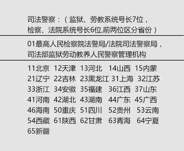 警号具有唯一性,由6位数字组成,第一位0一般都是公安厅或者省厅直属单位,第一位1就是省会城市,以此类推按照所在地市级别顺序排开头数字。第二位是所在地区划分,0和1是地级市市局和分局,2、3等是所在区县顺序数字,在往后就是入职顺序排号。